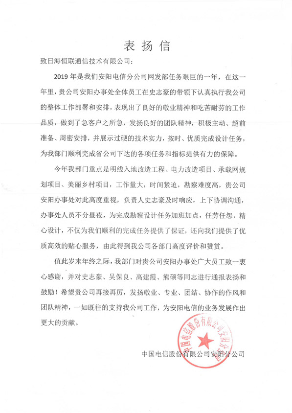 轉(zhuǎn)發(fā)“中國電信股份有限公司安陽分公司”對我公司員工的一封表揚(yáng)信