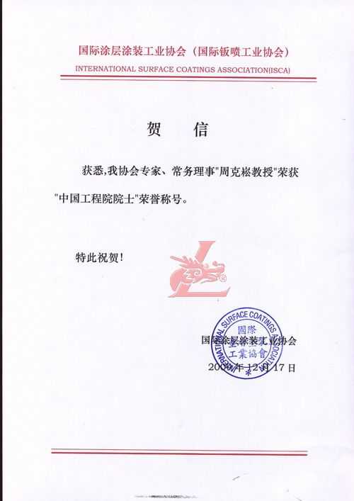 賀國際涂層涂裝工業(yè)協(xié)會專家常務理事克崧教授榮獲“中國工程院院士”[龍神秘書單位處] 賀國際涂層涂裝工業(yè)協(xié)會專家常務理事克崧教授榮獲“中國工程院院士”[龍神秘書單位處] 珠海龍神有限公司秘書處賀 2009-12-19 8898