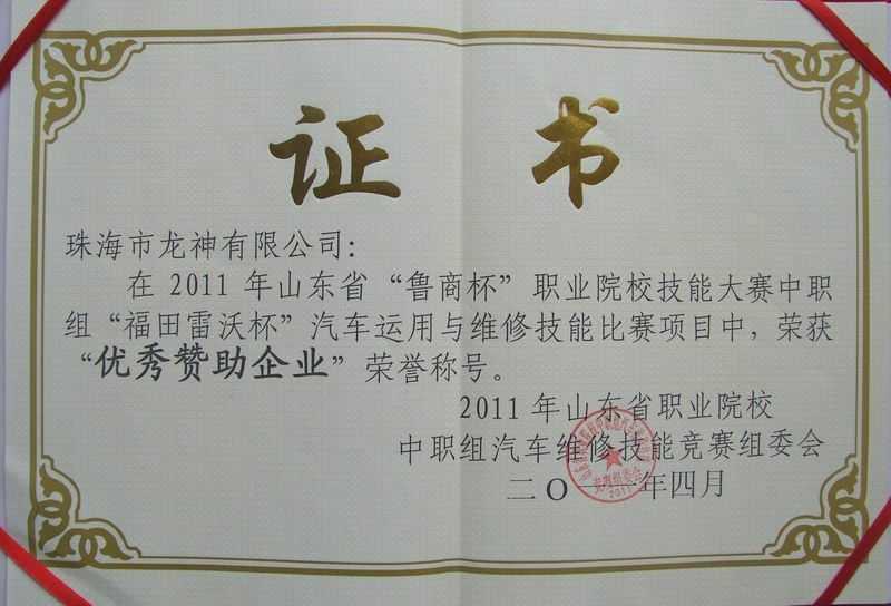 4月7日,在「2011年山東省“魯商杯”職業(yè)院校技能大賽」中職組“福田雷沃杯”汽車運(yùn)用與維修技能大賽項(xiàng)目中,我司榮獲“優(yōu)秀贊助企業(yè)”榮譽(yù)稱號。